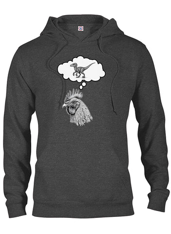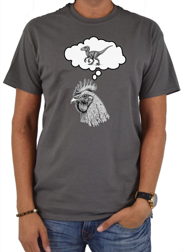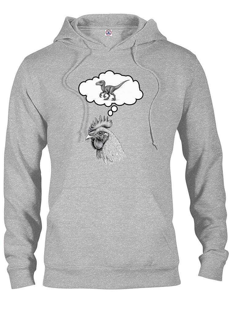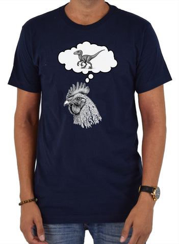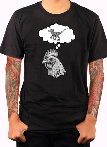 Get ready to ruffle some feathers with the hilarious and clever Rooster Dreams T-Shirt a must-have for animal lovers, meme collectors, and fans of evolutionary humor. This unique design features a striking black-and-white illustration of a rooster, deep in thought, with a whimsical thought bubble above its head. But this bird isn't dreaming of corn or coops — it’s imagining itself as a ferocious, sleek raptor, harkening back to its prehistoric roots.