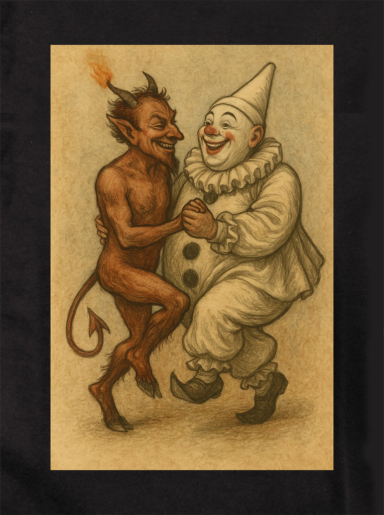 Inspired by classic illustration styles, this design brings together two timeless tricksters—the devil and the clown—locked arm in arm in a carefree dance that feels both unsettling and charming at the same time.