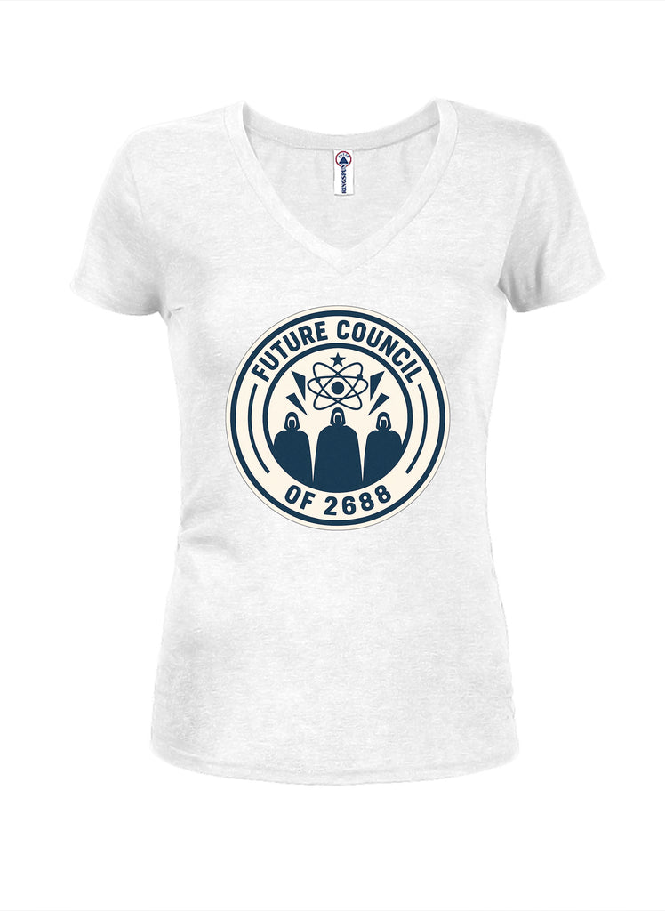 Journey into a future built on harmony, knowledge, and rhythm with this Juniors V-Neck T-Shirt, inspired by the visionary leaders who once shaped time itself. The bold circular emblem showcases three cloaked figures beneath an atomic symbol and radiant star, capturing the essence of enlightenment and unity. The inscription 2688 hints at a distant age where music and wisdom guided humanity toward a peaceful and balanced world. This design celebrates that hopeful spirit—the belief that great things happen when people come together in perfect harmony, with laughter and good vibes leading the way.
