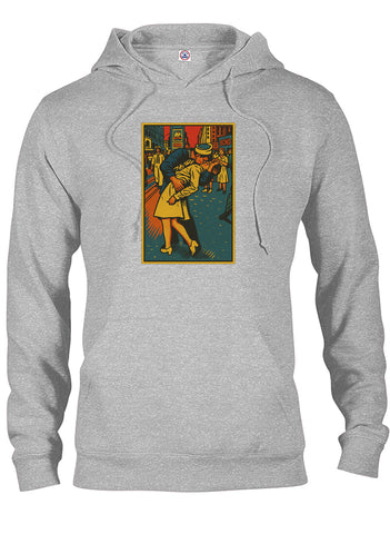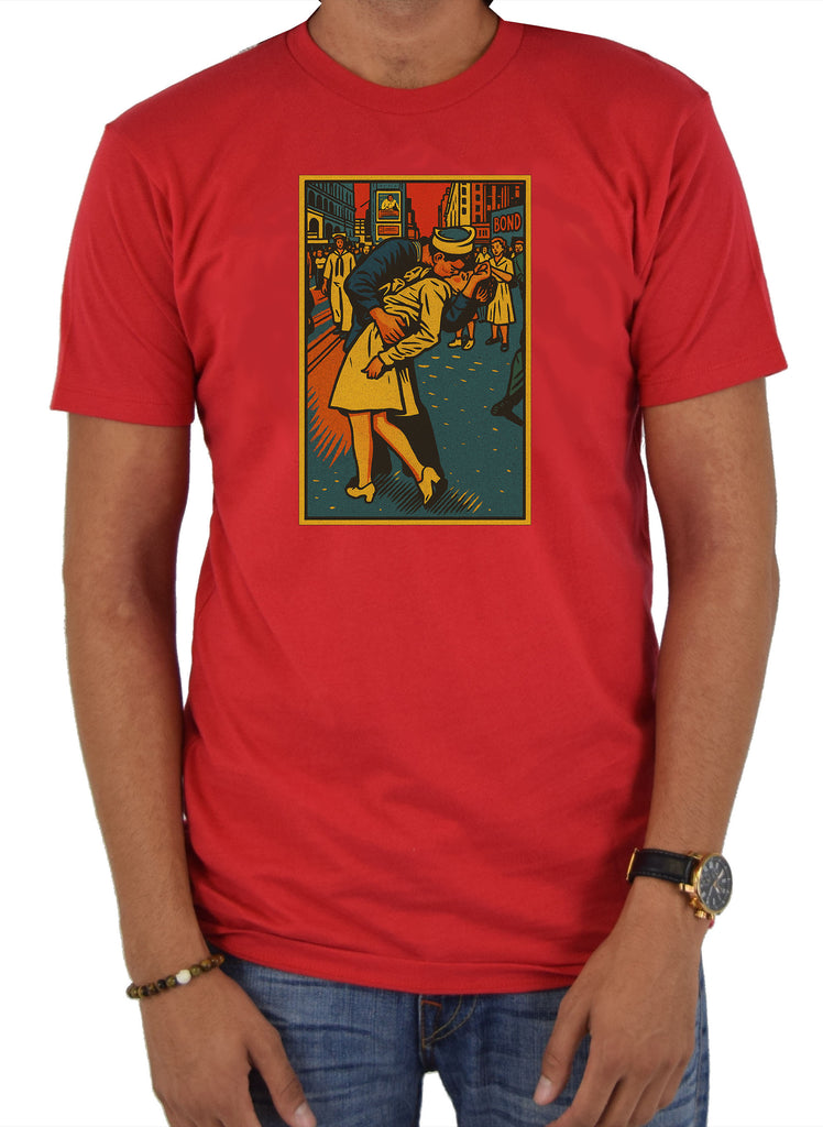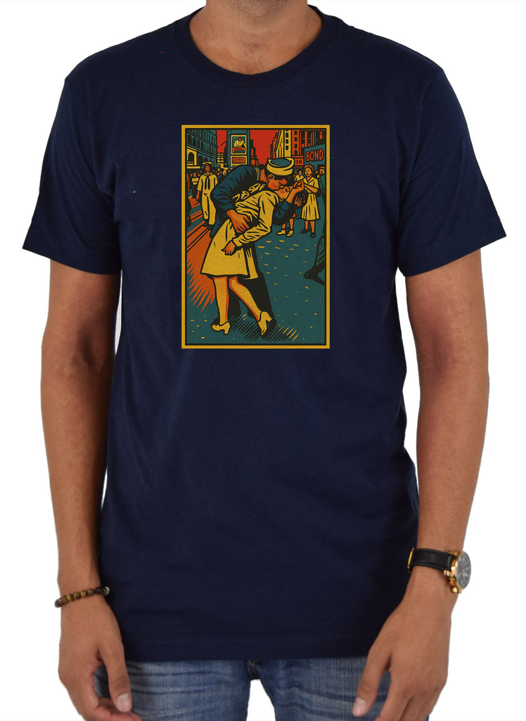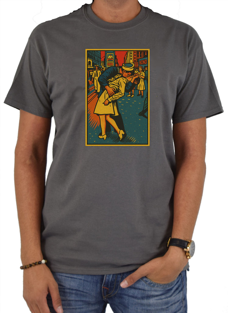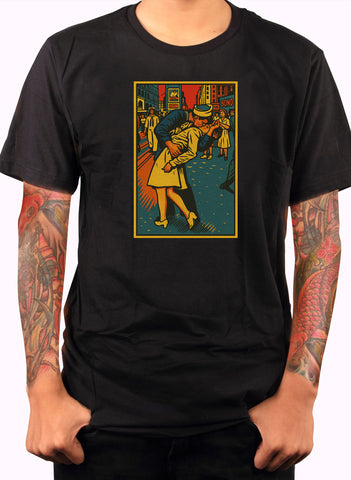 Celebrate a timeless moment frozen in history with the Wars End T-Shirt — a tribute to that iconic image of a sailor passionately kissing a young woman in the middle of a crowded street, a scene that came to symbolize the jubilation of a world finally tasting peace again. This legendary embrace, immortalized in countless photographs, movies, and murals, has become more than just a kiss; it represents the collective sigh of relief when conflict gives way to calm and strangers unite in spontaneous celebration.