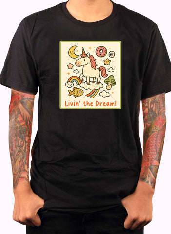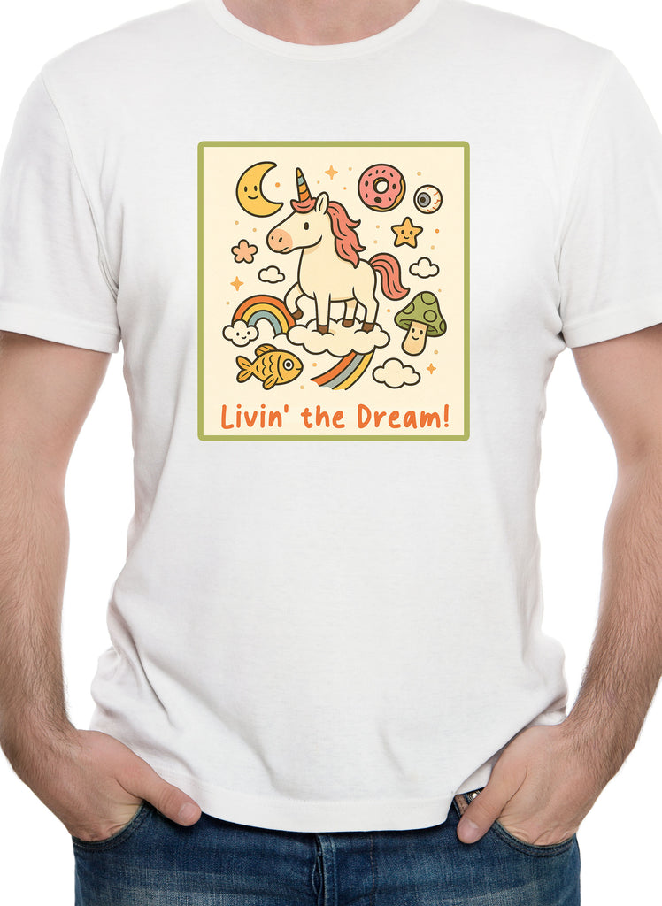 Escape reality and dive into a world of pure whimsy with the Livin' the Dream T-Shirt, a playful and funny addition to any meme lover’s collection. The entire scene is a mashup of sweet absurdity and meme-worthy humor that’s sure to get smiles and double-takes wherever you go. Beneath this fantastical collage, the phrase “Livin' the Dream!” serves as a reminder that sometimes the dream is all about embracing life’s silly side and letting your imagination run wild. Whether you wear it for lounging, parties, festivals, or just to make your daily errands more fun, this tee delivers maximum vibes with minimal effort