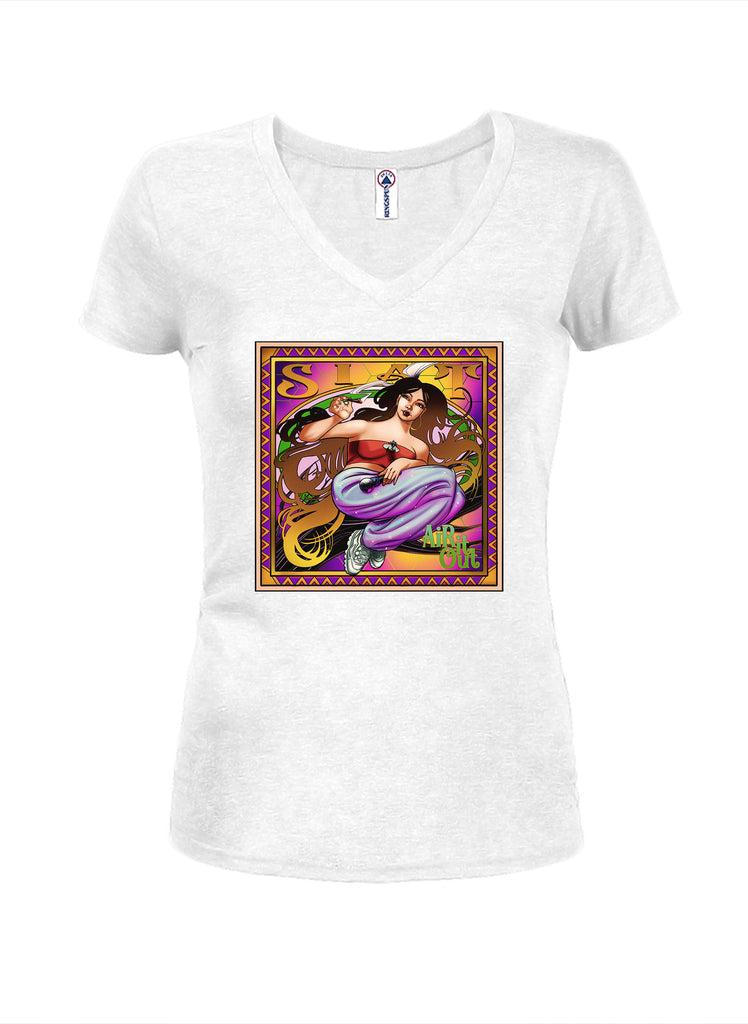 Step into a world where art, rhythm, and rebellion collide with this Juniors V-Neck T-Shirt. This striking design transforms street-inspired creativity into a wearable masterpiece, celebrating confidence, freedom, and individuality through vivid expression. The artwork features a dynamic female figure exuding power and poise — a muse for those who live unapologetically and breathe art into every part of their identity.