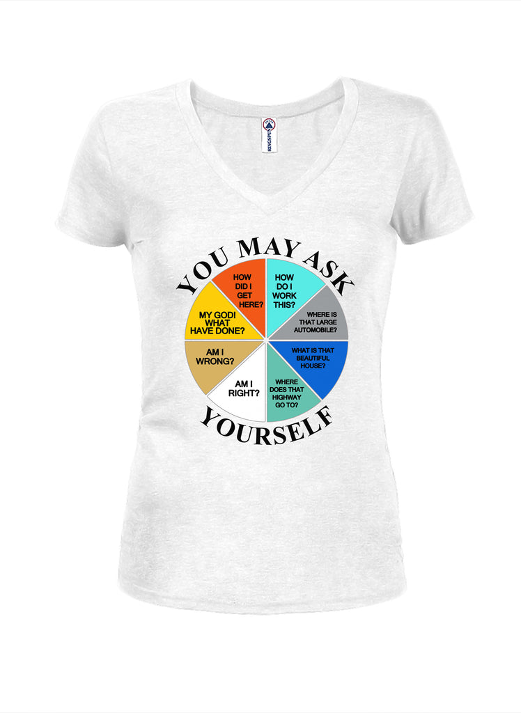 Bring humor, nostalgia, and clever self-reflection into your everyday style with the You May Ask Yourself Juniors V-Neck T-Shirt, a fun and expressive piece designed especially for those who love witty memes and iconic humor.