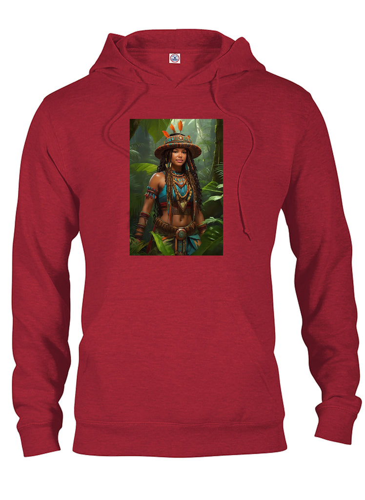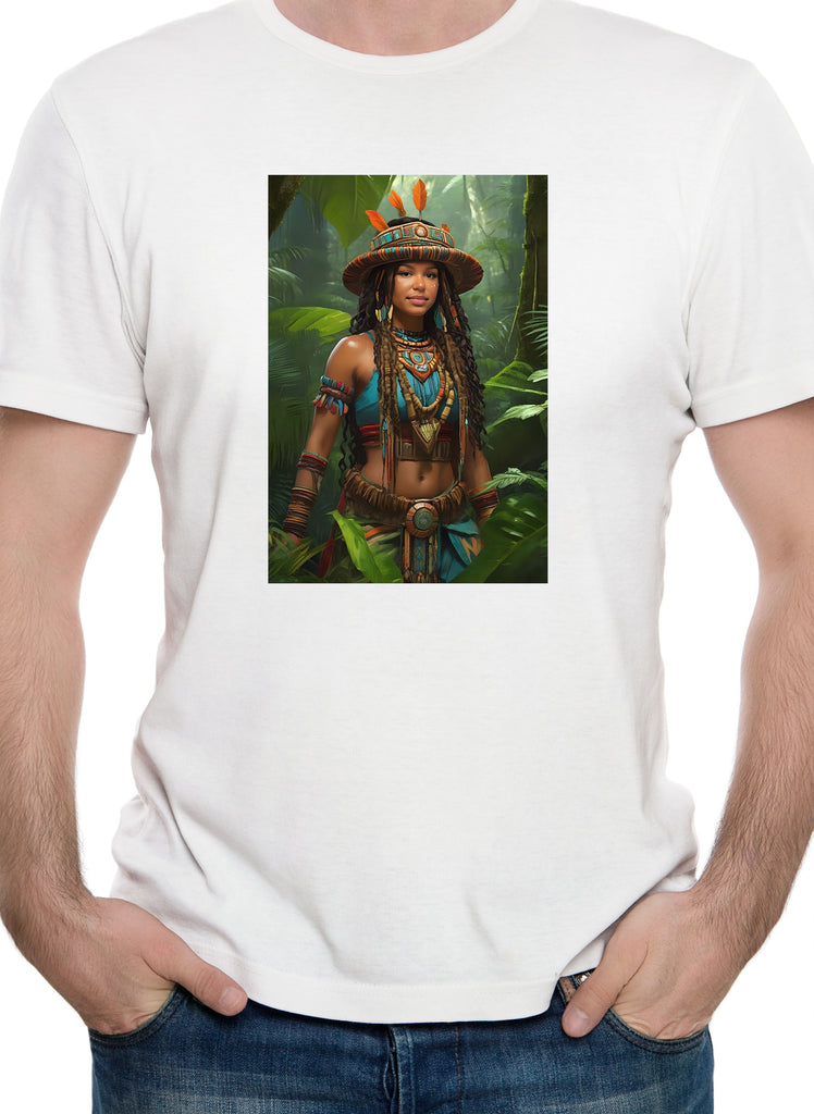 Immerse yourself in the untamed rhythm of nature with this graphic tee, a wearable expression of wild beauty and inner strength inspired by the creative world of an artist whose work flows between dream and reality. This stunning design captures the essence of a fearless jungle guardian — a symbol of harmony, freedom, and connection to the earth. Her intricate beadwork, feathered crown, and tribal adornments reflect an ancient wisdom reimagined through modern art, blending vibrant colors and textures that radiate vitality and courage.