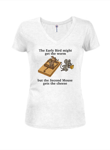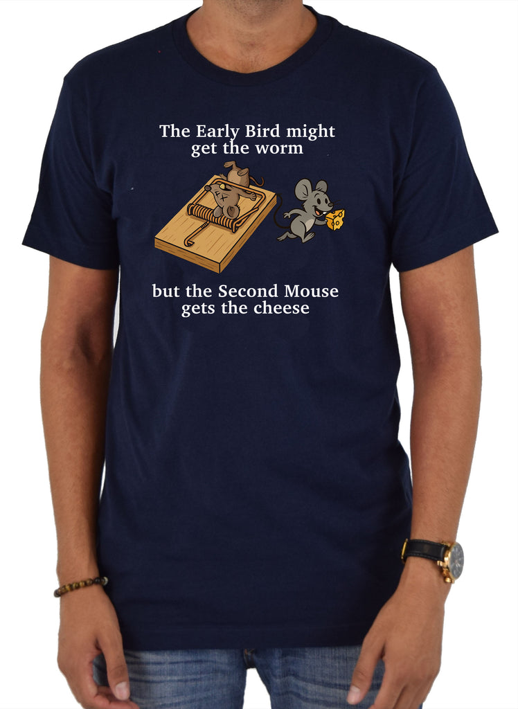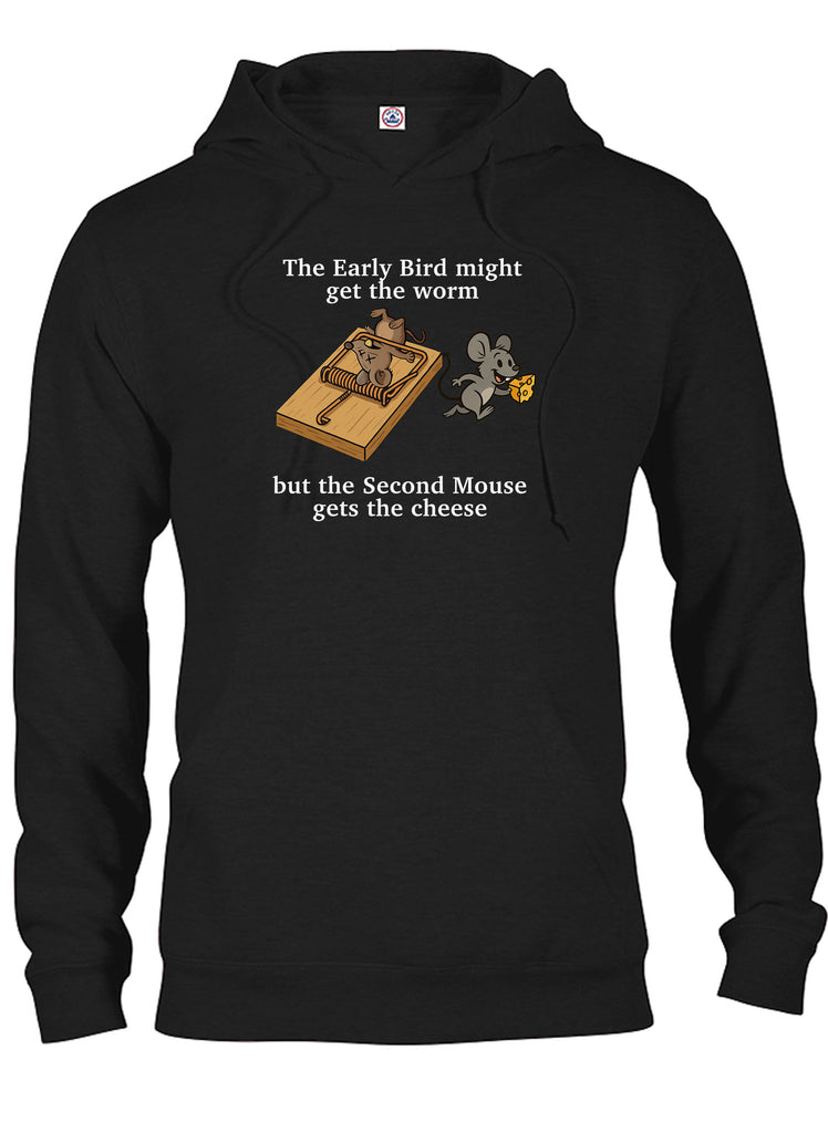 This funny and eye-catching design features a cartoon mousetrap scene that feels straight out of Saturday morning animated classics. One unlucky mouse lies trapped after going for the cheese too early, while the second mouse confidently struts away holding the prize. Paired with the witty phrase, “The early bird might get the worm, but the second mouse gets the cheese,” this shirt is a playful reminder that patience and strategy often win in the end.