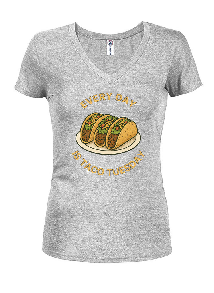 Why limit the taco celebration to just one day? With the "Every Day is Taco Tuesday" Juniors V-Neck T-Shirt, you can let the world know that tacos are always on the menu — no calendar check required. This quirky and adorable t-shirt is a must-have for food fanatics, meme queens, and anyone who believes in living life with extra salsa on top.