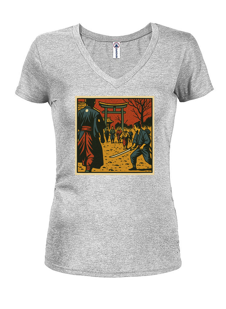 Bring a touch of classic cinematic drama to your everyday look with the Showdown Juniors V Neck T-Shirt, a striking tribute to the timeless tales of warrior honor and epic confrontations. The bold colors and vintage graphic style evoke the feel of old film posters and manga panels, celebrating the spirit of loyalty, courage, and personal code that define some of the greatest stories ever told on screen.