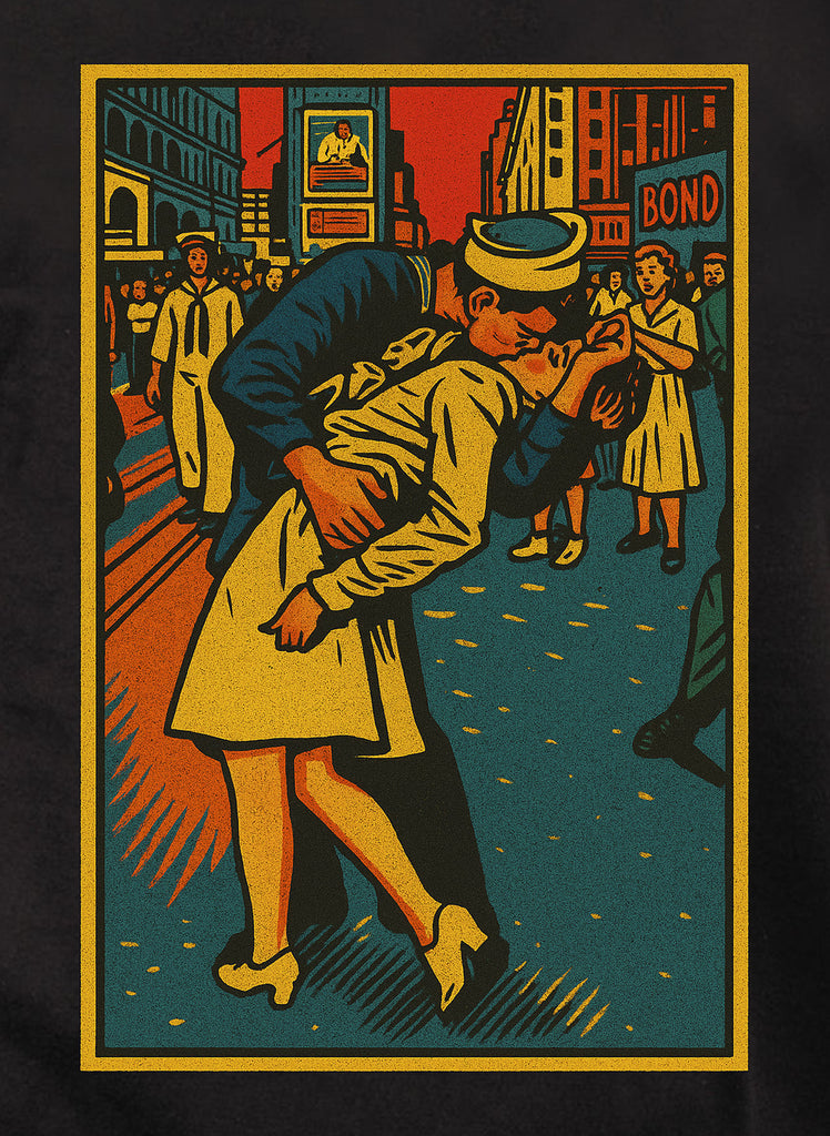 Let the next generation wear a piece of unforgettable history with the Wars End Kids T-Shirt, a fun and meaningful way to share the story behind one of the most famous kisses ever captured. This iconic image shows a sailor lifting a young woman into a joyful kiss right in the middle of a busy street, a symbol of pure celebration when war finally ended and families could dream of peaceful days again.
