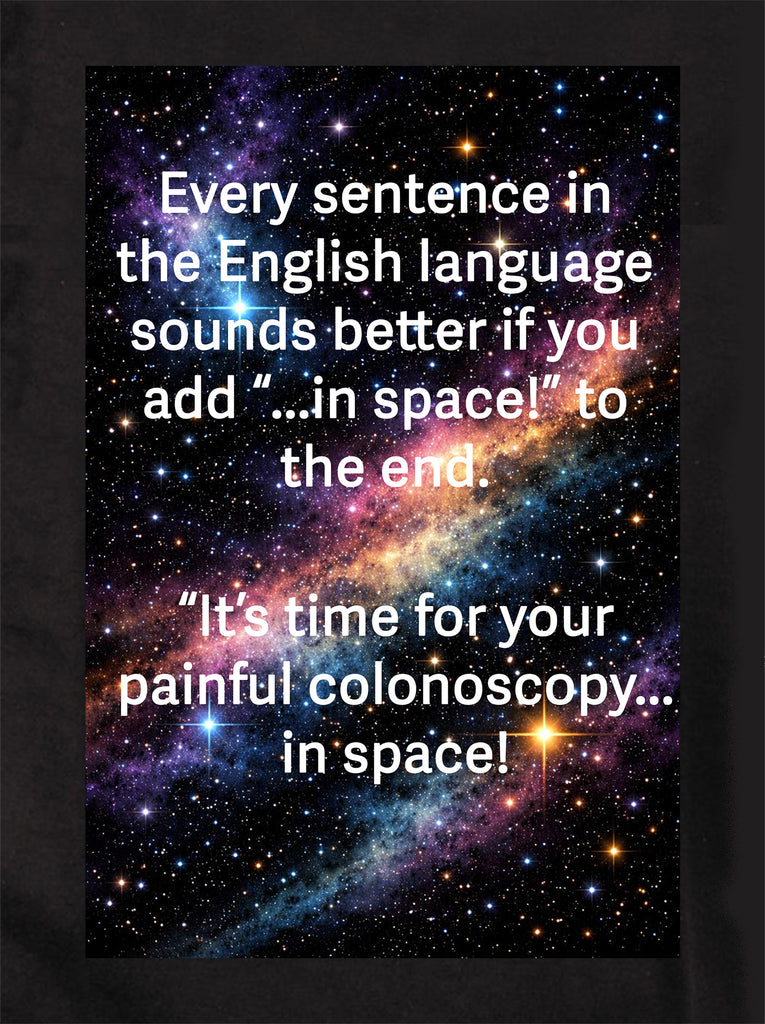 Blast humor into a whole new dimension with the In Space T-Shirt, a perfect fusion of cosmic visuals, clever wordplay, and laugh-out-loud meme culture. Set against a vibrant, galaxy-filled background, the text pops like a cosmic announcement drifting through the stars. The space theme adds a dramatic, over-the-top flair that contrasts perfectly with the dry humor of the phrase, making it ideal for casual wear, conventions, science lovers, stargazers, or anyone who enjoys a good visual joke. Whether you’re wearing it to spark conversations, earn a few knowing laughs, or simply show off your love for space-themed memes, this shirt does all the heavy lifting—zero gravity required.
