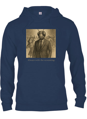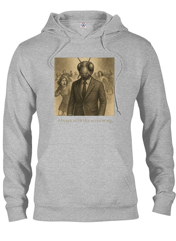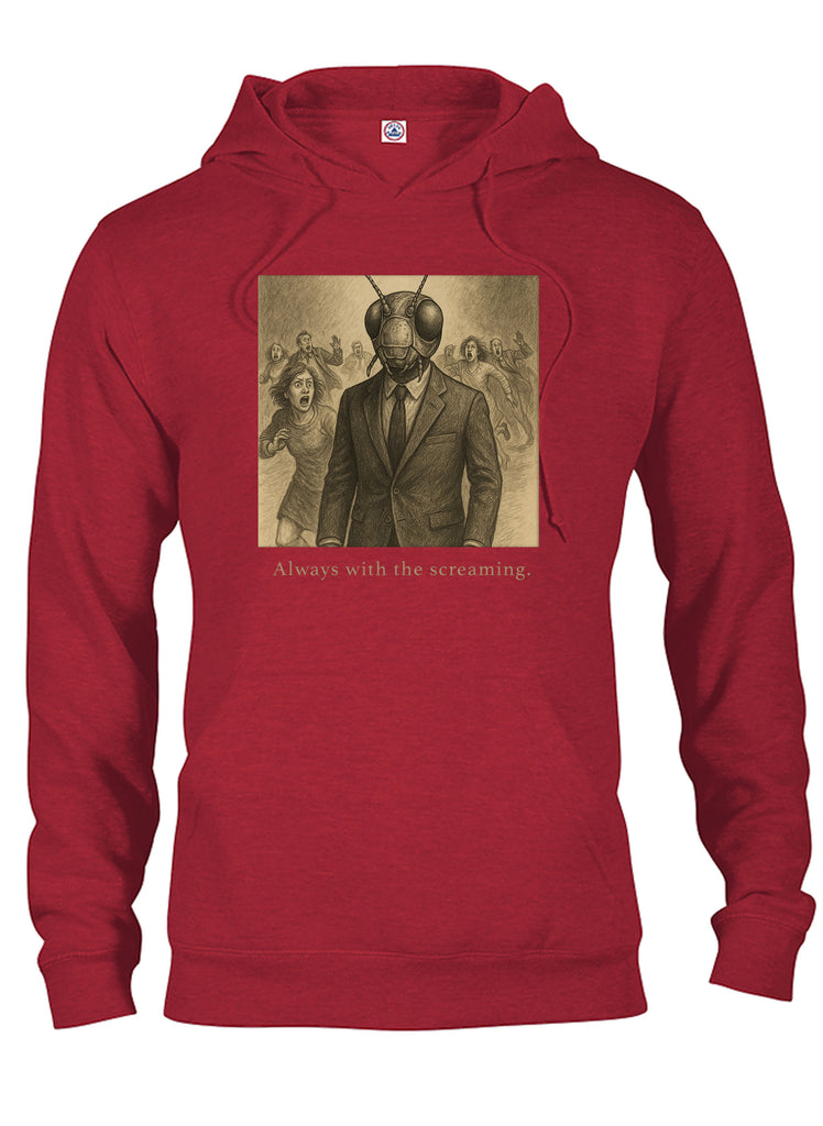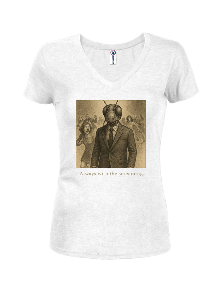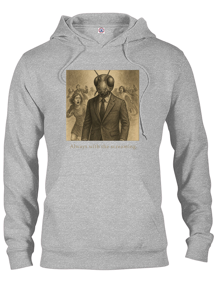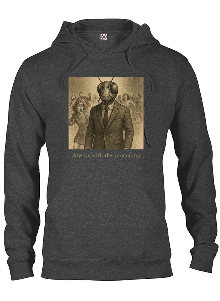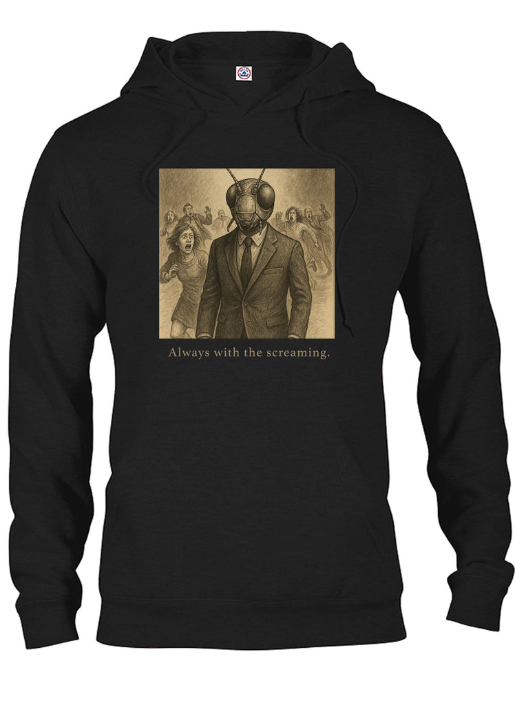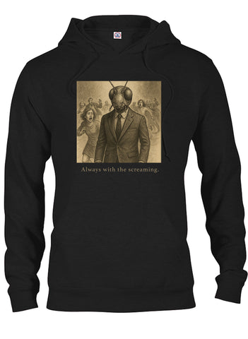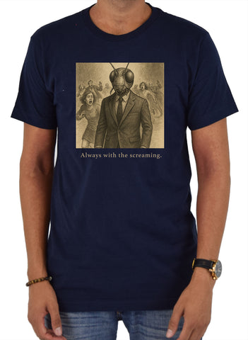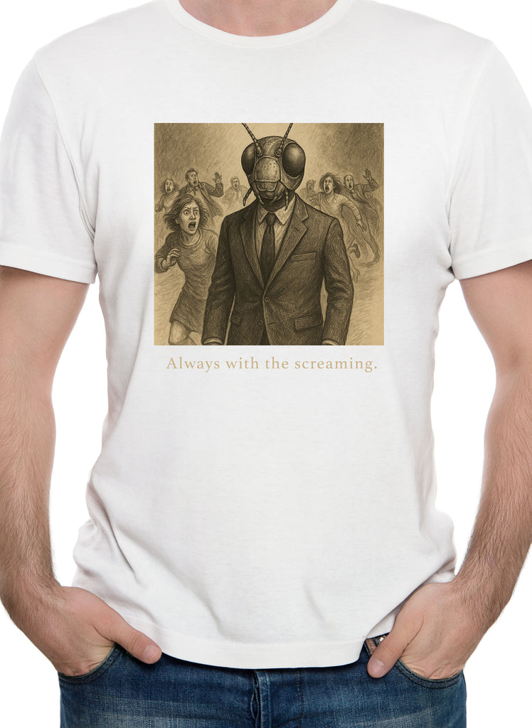 Step into the perfect blend of horror and humor with the “Always with the screaming” T-Shirt, a standout piece for fans who love eerie visuals mixed with a wicked sense of comedy. Inspired by that unforgettable moment when a calm, sharply dressed figure with an insect-like head walks through chaos while everyone around them panics in over-the-top terror, this shirt delivers a unique attitude that’s equal parts creepy and hilarious.