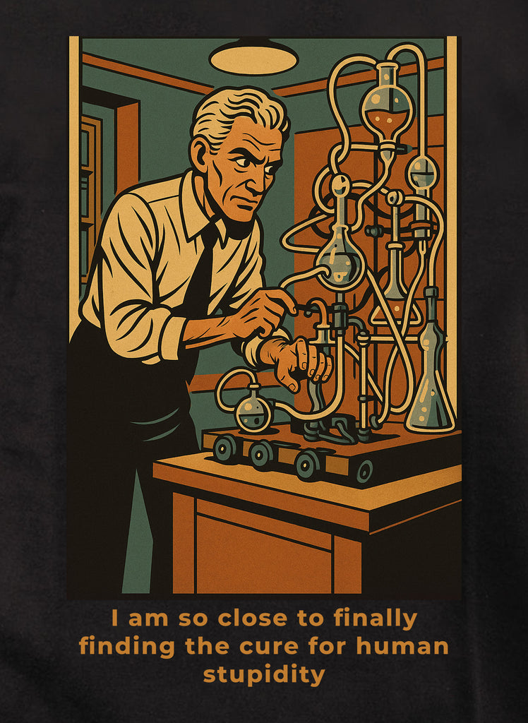 Let your child’s sense of humor and love for science shine with the “I Am So Close to Finally Finding the Cure for Human Stupidity” Kids T-Shirt, a playful and eye-catching design that mixes curiosity with clever comedy. Featuring a retro-style illustration of a determined scientist working through a tangled setup of tubes, beakers, and bubbling chemicals, this shirt delivers a fun visual twist that kids instantly find entertaining. Whether your child is fascinated by experiments, enjoys science-themed humor, or simply wants a standout shirt that feels different from the usual, this tee fits right in with their playful personality.