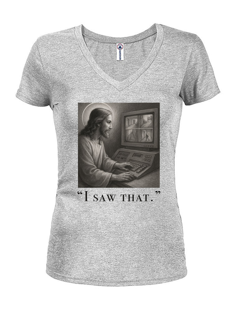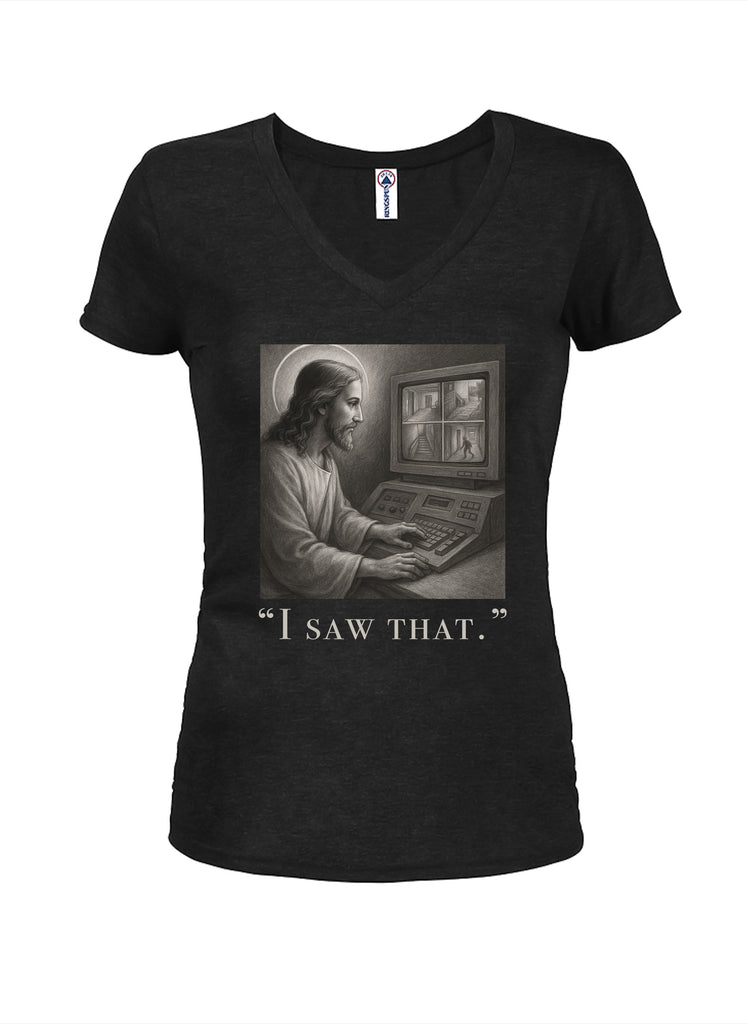 This Juniors V-Neck style adds a flattering, fashionable twist to a meaningful message, making it perfect for everyday wear, church activities, youth group events, or casual outings. The design speaks to a timeless Christian truth—that Christ watches over all people—while placing it in a modern setting filled with screens, consoles, and digital imagery.