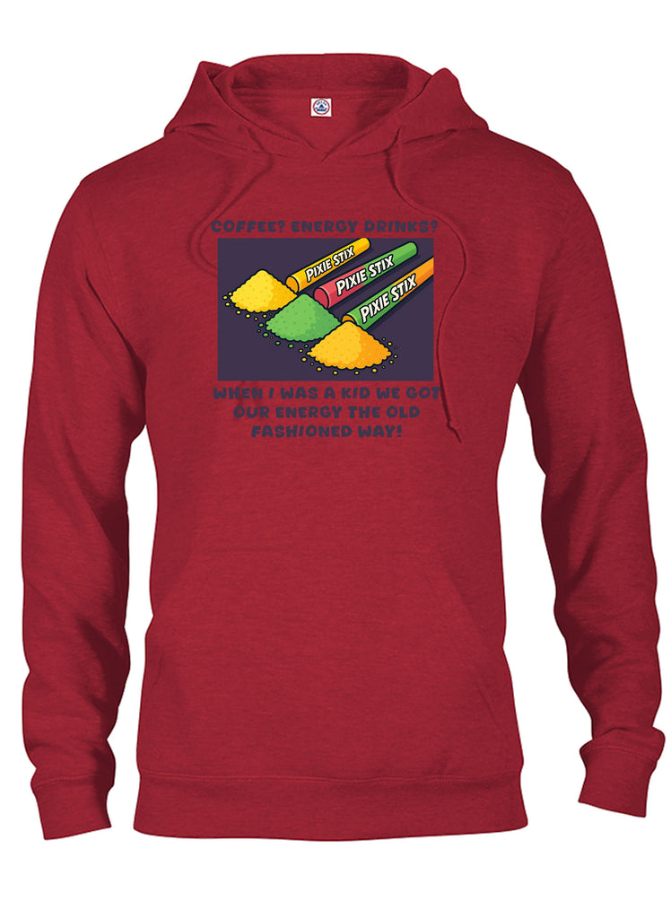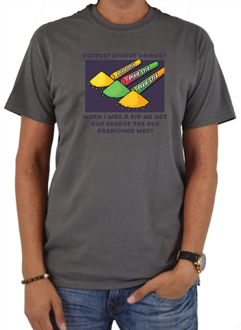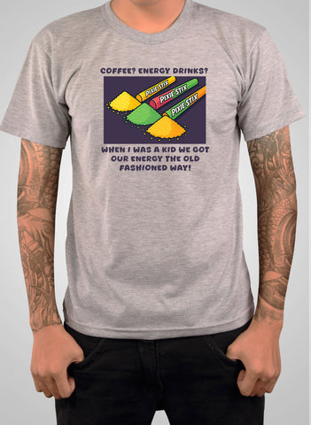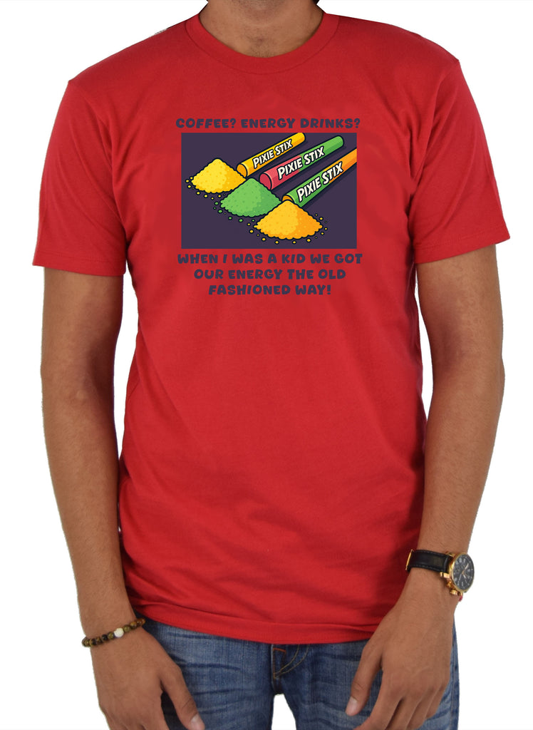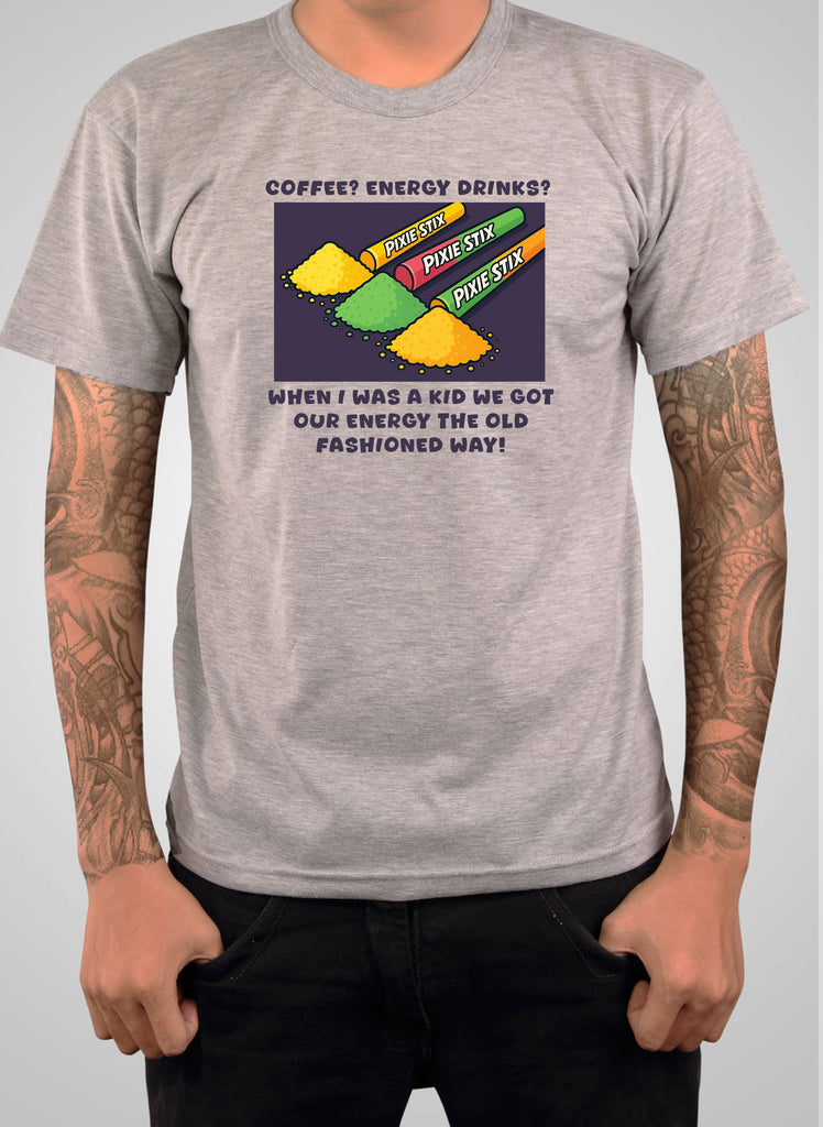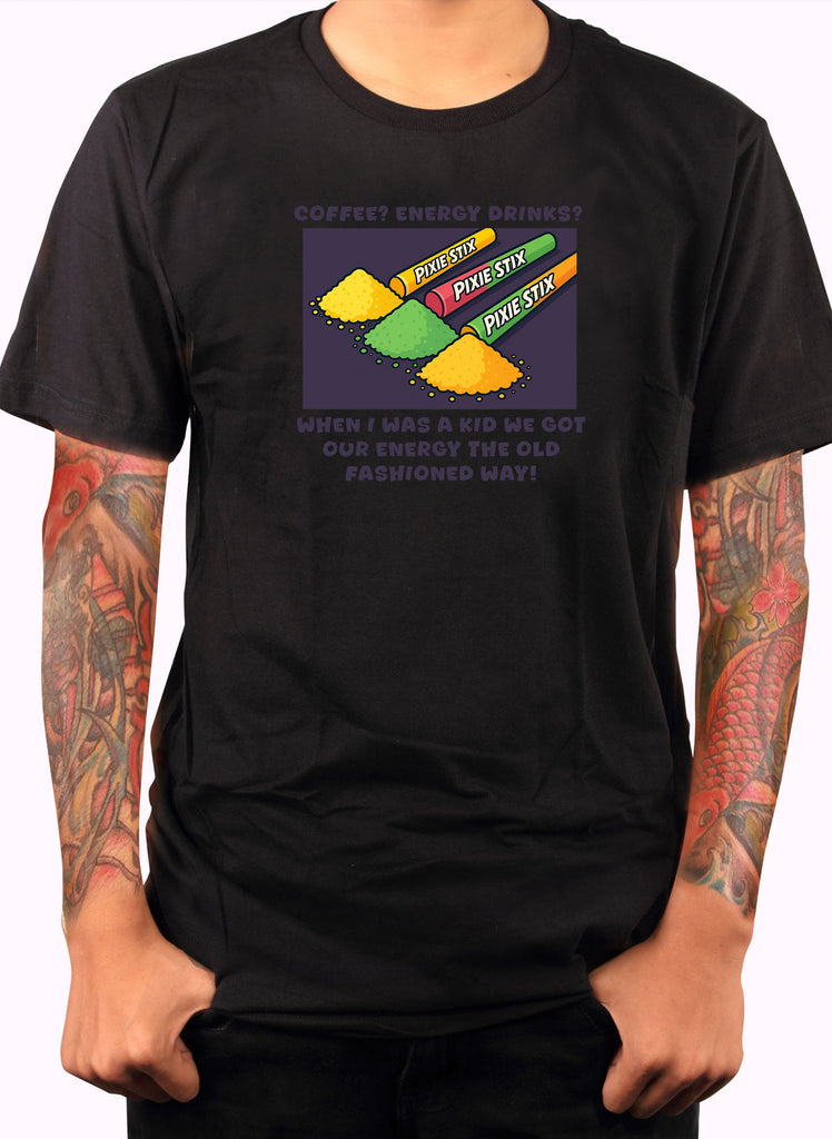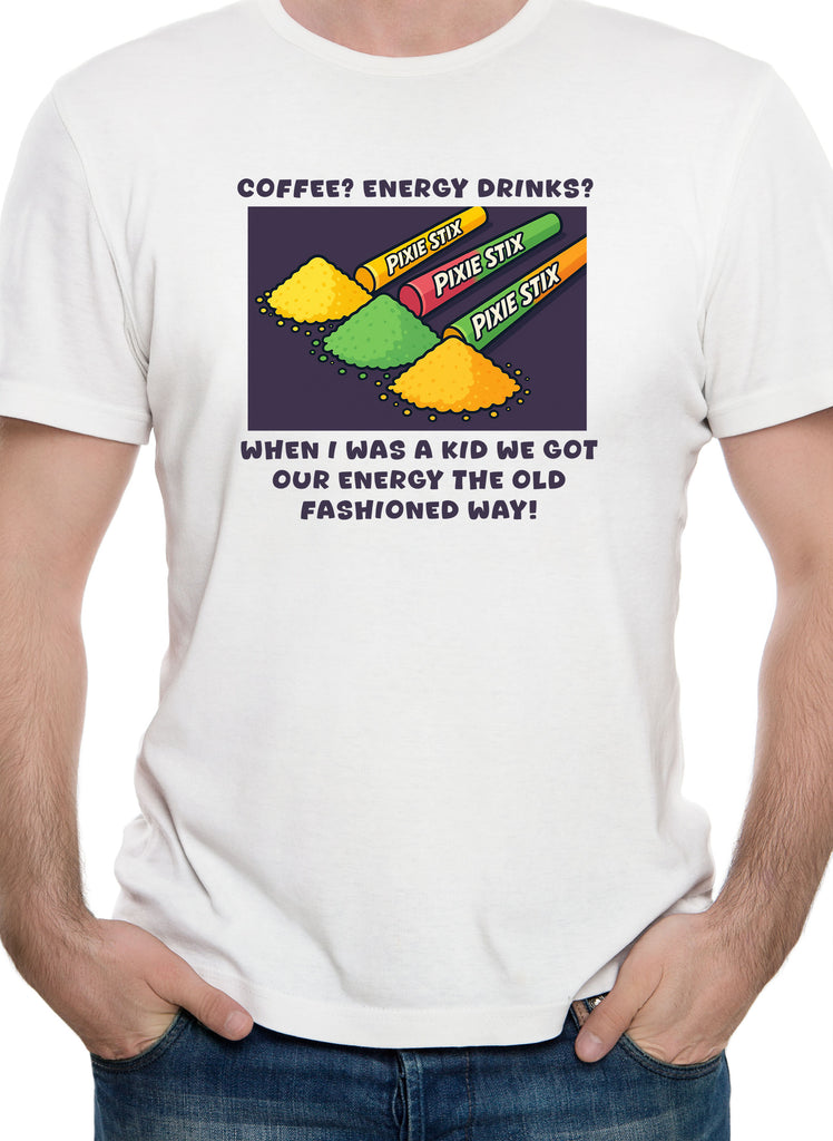 Fuel your day the old-school way with our hilarious Pixie Sticks T-Shirt, a nostalgic nod to the ultimate childhood sugar rush. Designed for fans of funny food memes and retro energy hacks, this shirt features a bold and colorful graphic of three iconic Pixie Stix spilling vibrant mounds of powdery sugar in yellow, green, and orange. Above and below the image, the witty caption reads: “Coffee? Energy Drinks? When I was a kid we got our energy the old fashioned way!” — perfectly summing up the chaotic, candy-powered spirit of growing up in a pre-energy drink world.